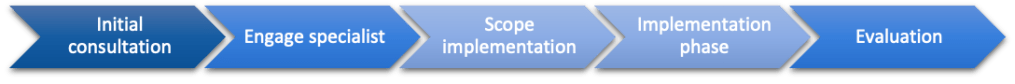 | The First Consultation meeting is conducted free of charge by an organizational development consultant. The purpose is to gain a solid understanding of client’s request and identify which of our specialist consultants is best suited to be working on the project. At the end of this phase, we provide the client a proposal outlining our initial recommendations and the associated fees necessary to proceed | Once the client has decided to proceed to the next phase, MUMTAZ RANA will introduce the specialist(s) we believe to be the most suited to the project. The specialist consultant will then conduct a deeper diagnostic analysis in order to provide a set of clear recommendations. The length of time this phase will take depend on the complexity of project issue and the work involved in the project. | In many cases, the client company will choose to implement the recommendations of the specialist consultant on their own, with the specialist consulting to act in the advisory capacity only. However, should the client with RSM to manage the implementation of the recommendations, this can be contracted for at this point | The recommendations are implemented as agreed. | Regular feedback will be sought throughout the process with an additional evaluation conducted by the RSM project manager on completion of the project. |