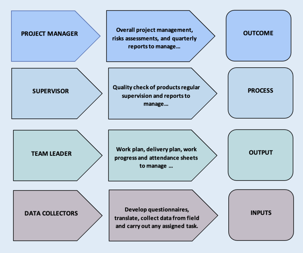 Firstly, there are the standard elements of MUMTAZ RANA projects, ensuring the division of responsibilities between the project core team members (Team Leader, Supervisors and Project Manager). Secondly, there is a work plan – outlining the activities to be delivered and their time frame.